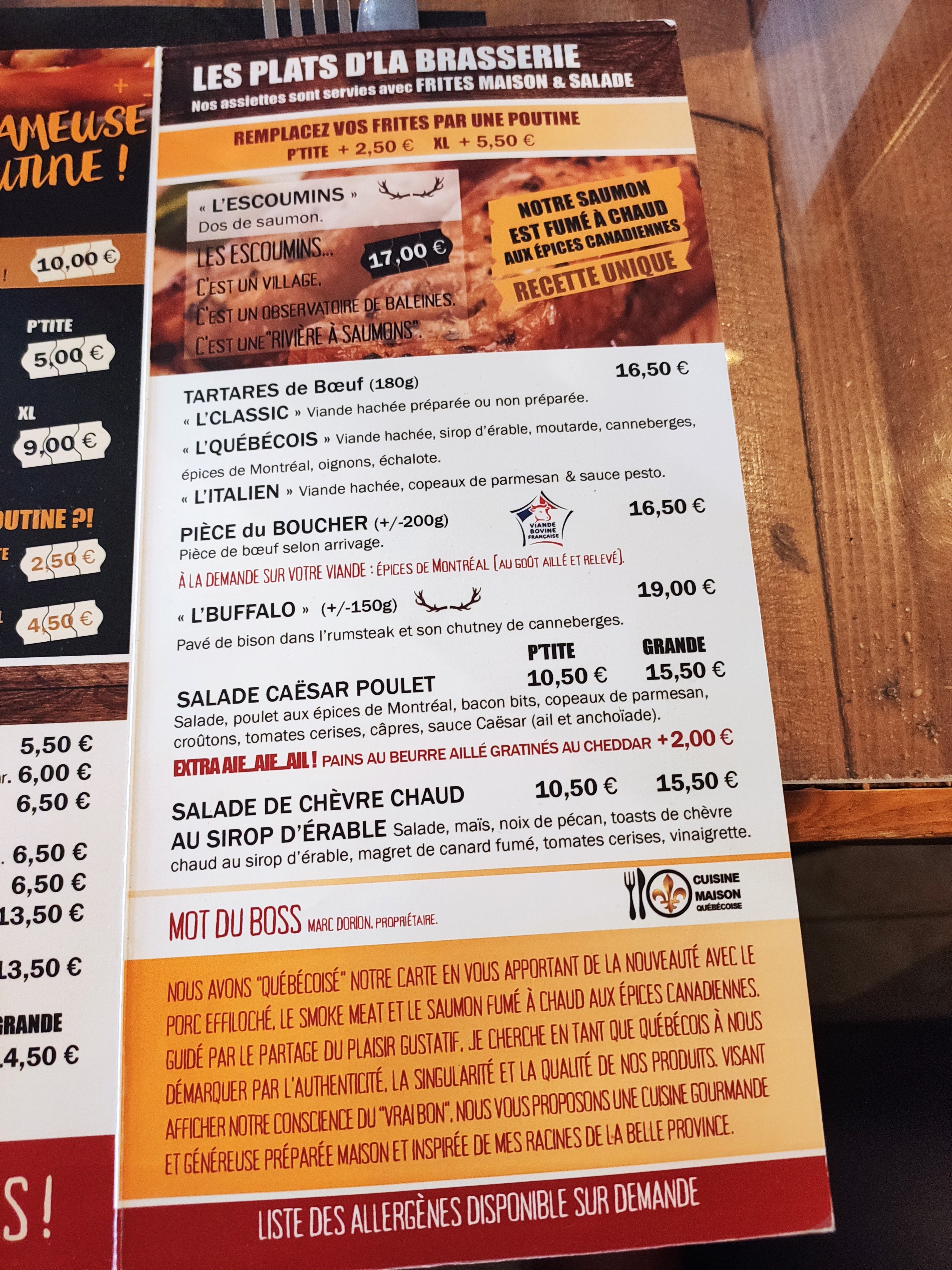 Nous y sommes allés pour découvrir la fameuse poutine..... Nous en sortons très déçu... Le patron est sympa mais c est le seul bon côté . La salle est sans charme, et nous avons pas aimé notre repas qui s'est composé d un burger de petite taille très sec et d une poutine que nous n avons pas aimé. Nous avons testé mais nous n'y reviendrons pas.