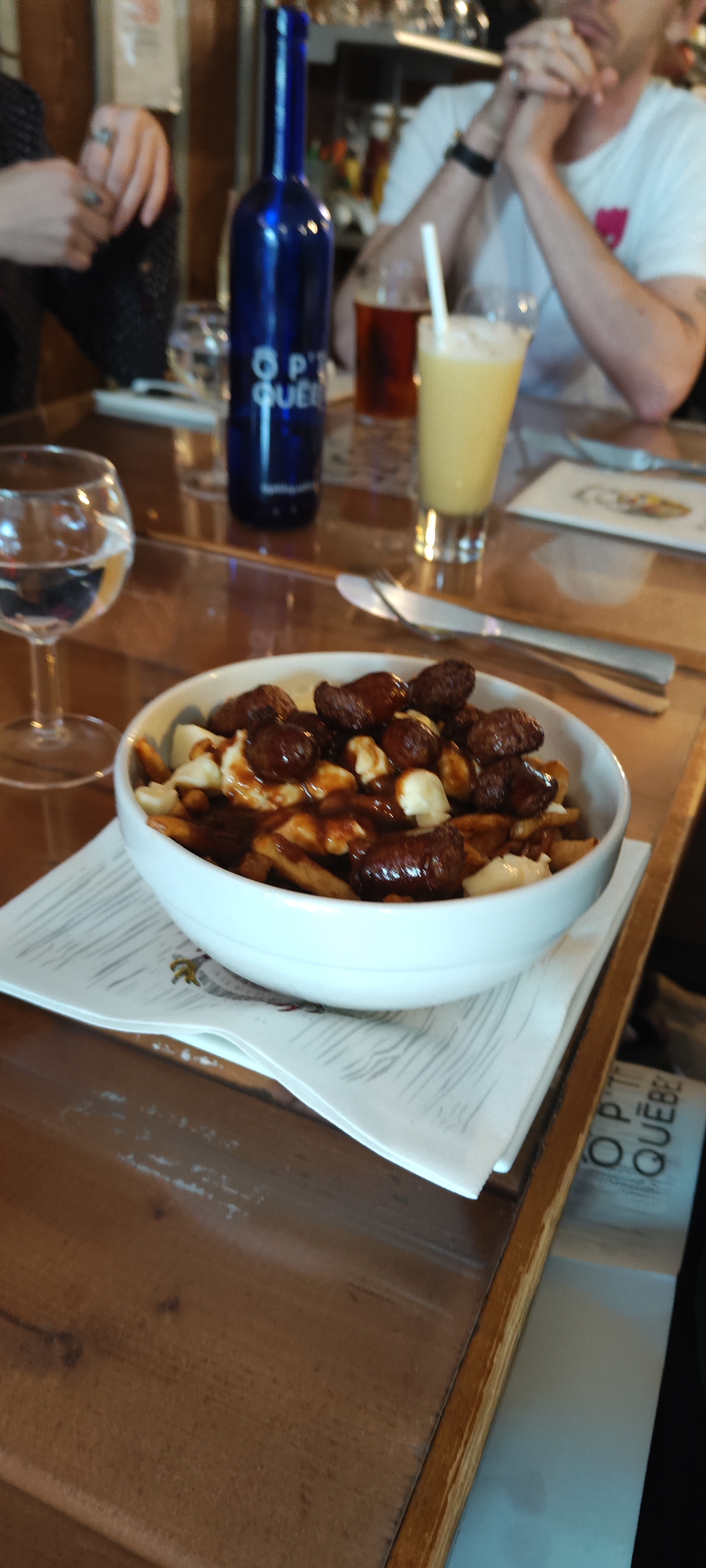 La poutine n'est pas comme la vraie poutine québecoise mais reste une référence en la matière avec ses frites maison. ( on regrettera le fameux fromage pouic pouic qui couine sous les dents) . La bière au canneberge et au sirop d'érable sont tout simplement excellents!!! Si vous choisissez le menu à 18€ vous aurez de la peine à vous lever de votre chaise! Ce restaurant est un endroit convivial, bien décoré ou on peut retrouver l'ambiance québecoise particulière. Petit bémol : on a l'impression que les serveurs et le chef de l'établissement sont devenus moroses, tristes, ont perdu leur enthousiasme qui n'est pourtant pas l'habitude des québecois . ( remarque vu le temps de bordeaux je pense savoir pourquoi .... )