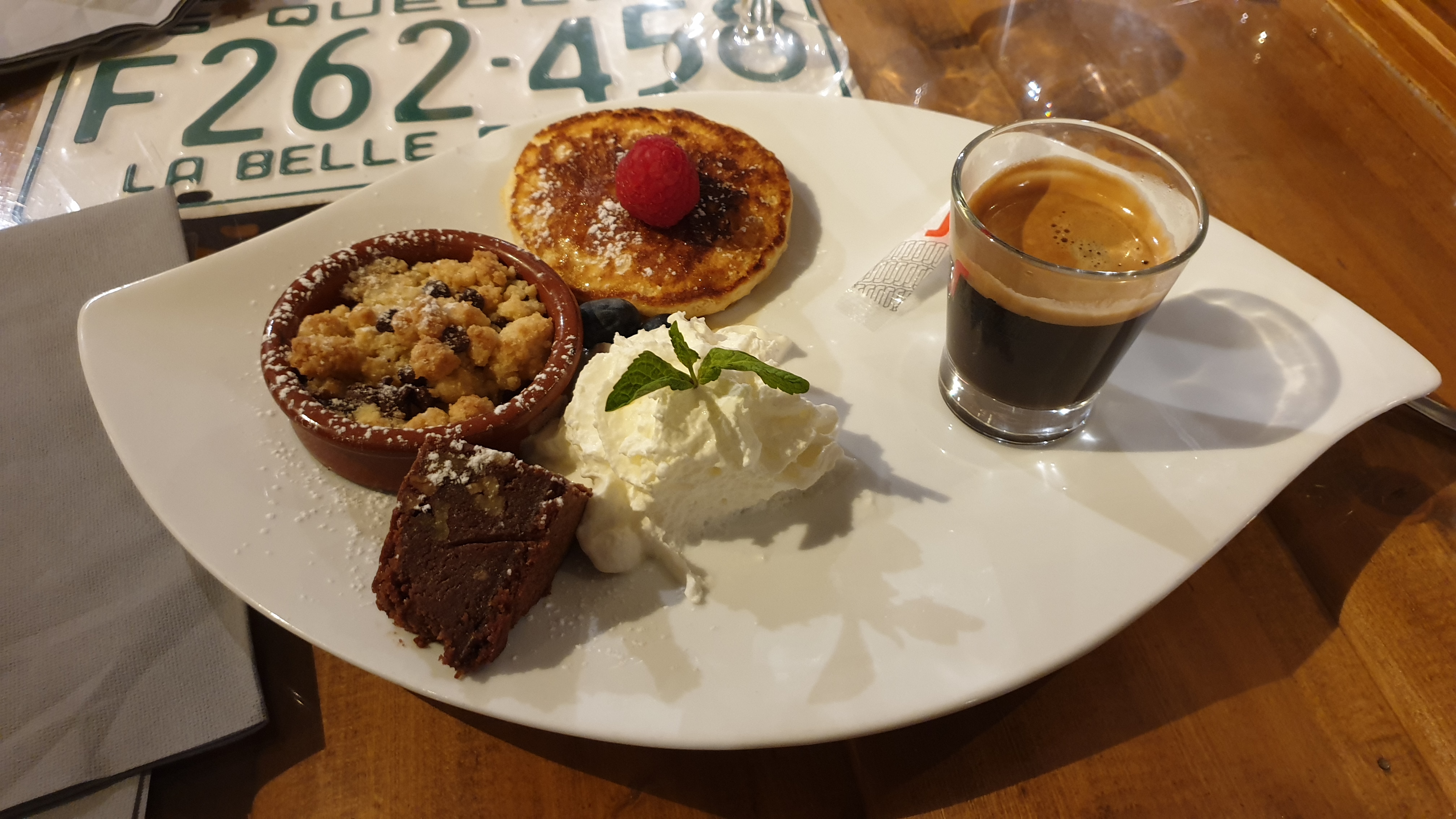 Plats très bons, originaux et très copieux. Accueil chaleureux de la responsable, serveuse très gentille. J'ai bien regardé 9 minutes d'attente pour les plats et 25 minutes pour les desserts, un samedi soir. Parfait merci encore nous reviendrons!