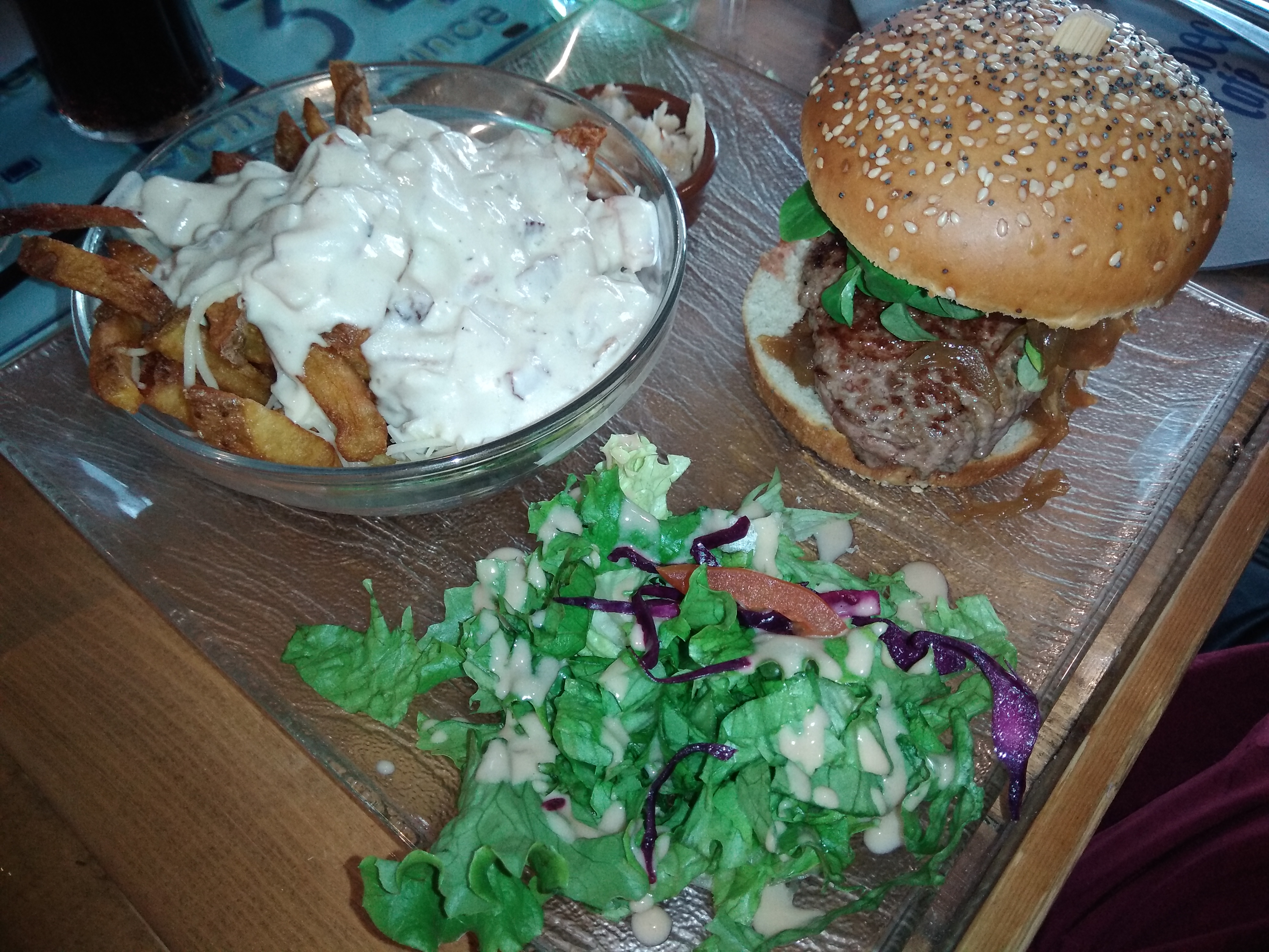 Hamburgers maison avec de vrais steaks bien épais et moelleux... Avec une vraie poutine 'comme là bas'.. Pas donné mais justifié. Finir les hamburgers taille Méga est un exploit 😍😍😍