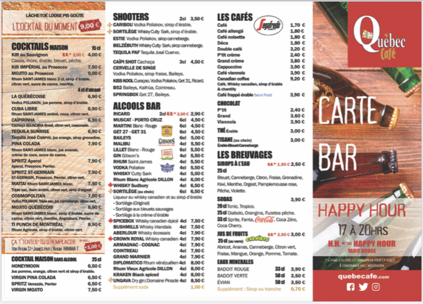 Satisfaits de notre dernière visite, cependant depuis l'année dernière la carte a été réduite, avec moins de choix de burgers (6 contre 9), moins de desserts (plus de crumble ni pancakes), plus aucune coupe glacée, et moins de choix de bière (seulement 2 dans la gamme Ô contre 4 avant il me semble, la rousse que j'avais prise n'y était plus). Apparemment la carte est plus étoffée dans le Québec Café de Bordeaux. Mais l'ambiance québécoise est toujours là heureusement !