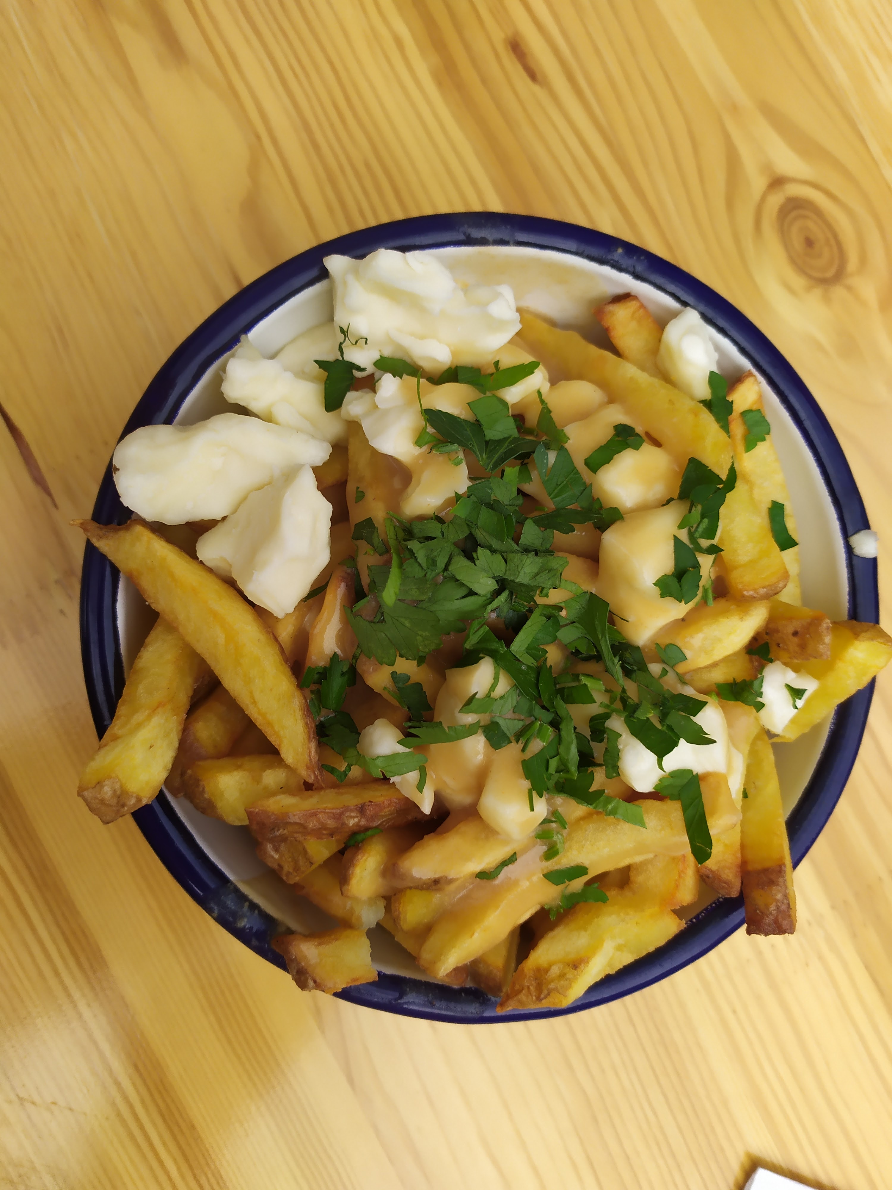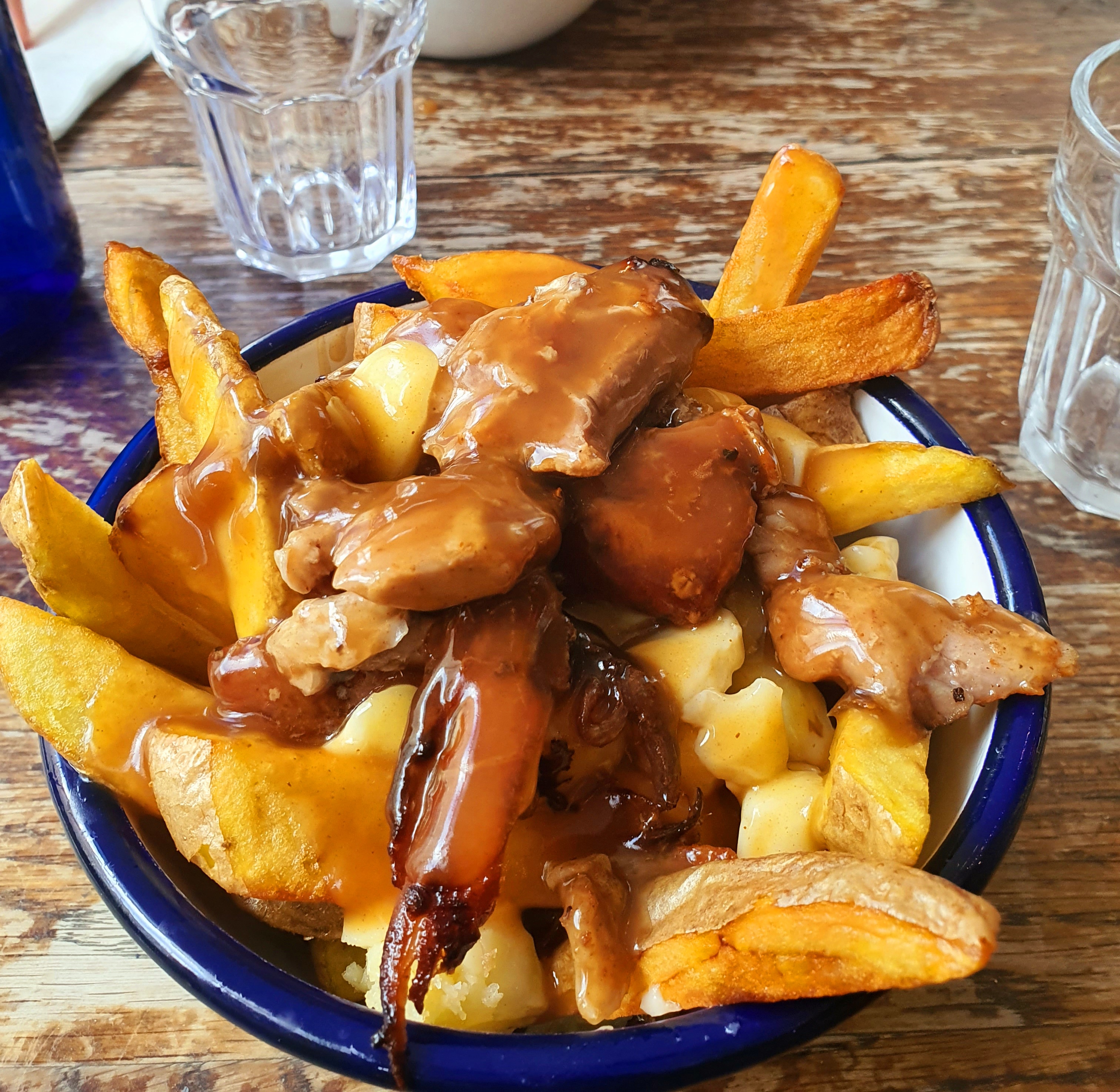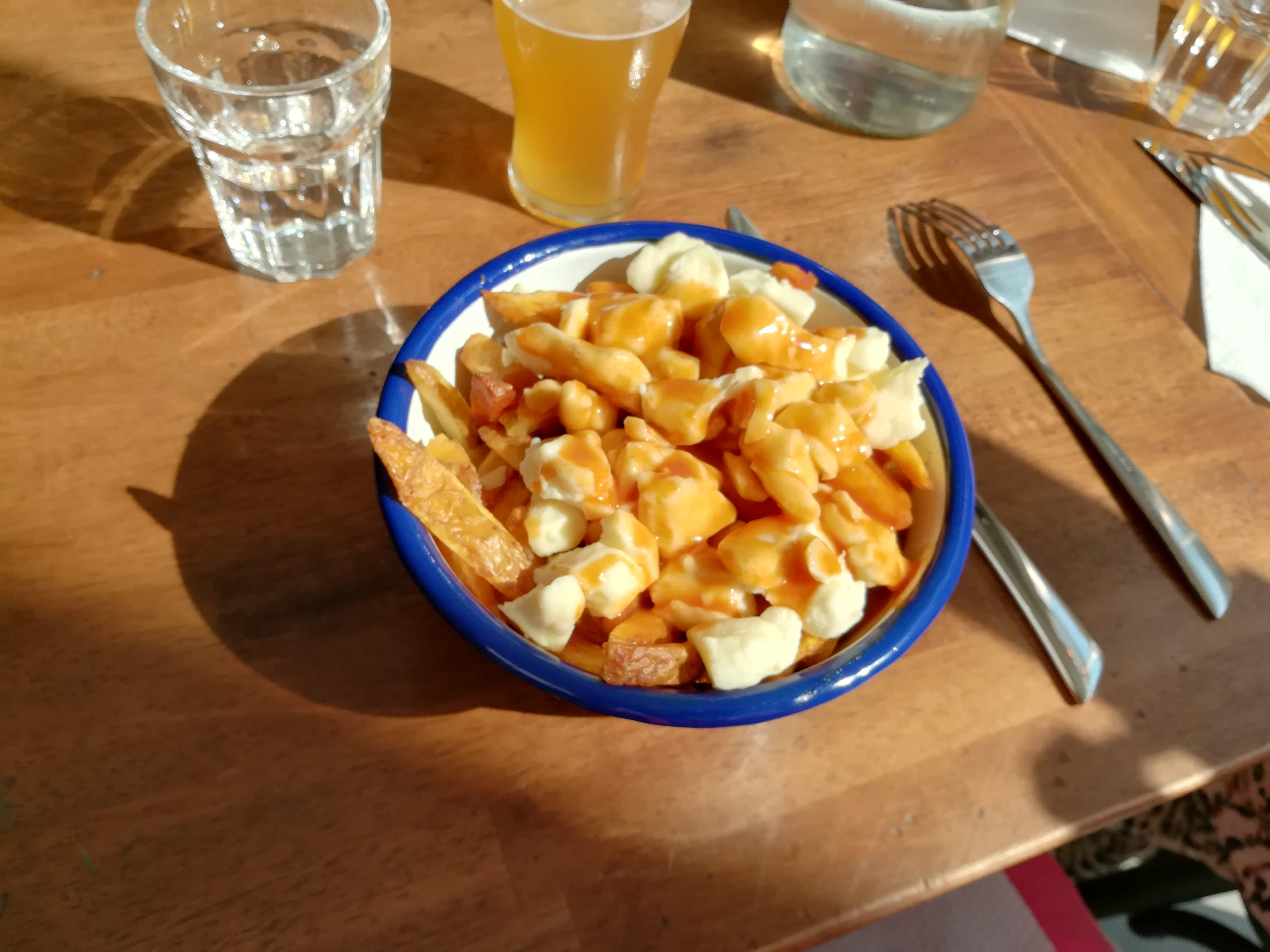 Une poutine délicieuse comme on en trouve au Québec ! À ne pas manquer, je recommande la poutine aux oignons moutarde de sapin, un délice !