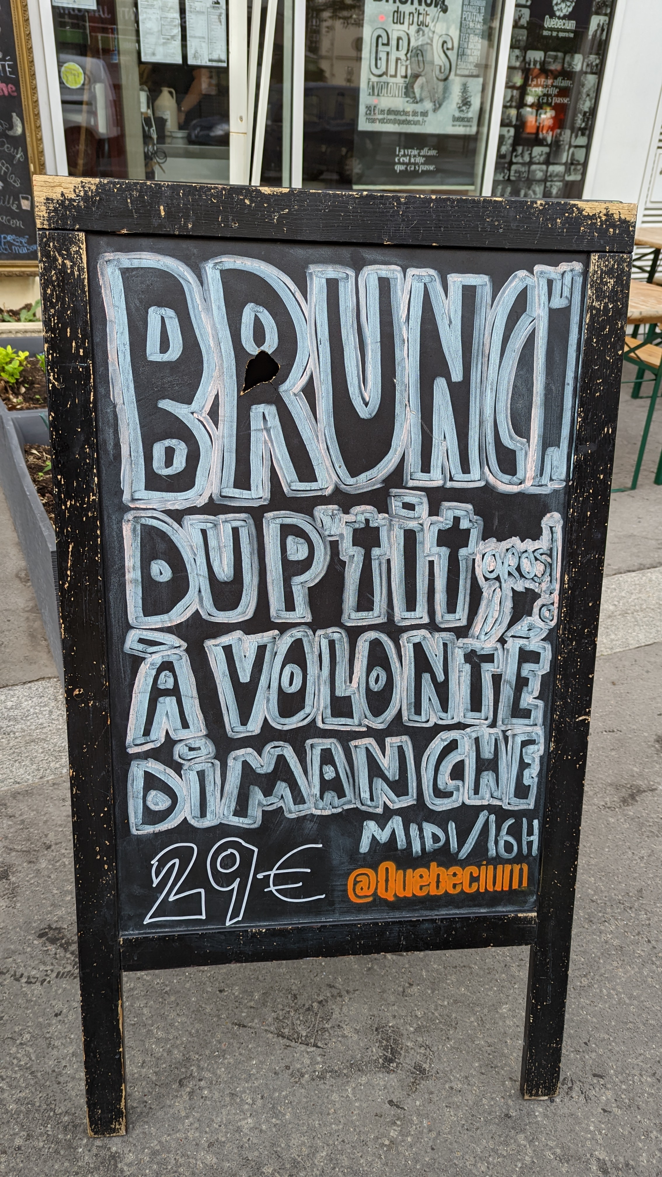 Hello Al, merci pour votre commentaire Pour 29 € un brunch à volonté avec : Café, thé chocolat chaud, jus d'orange, jus de pamplemousse, Fruits de saison, céréales, granola, gateaux de toutes sortes, Plusieurs type de pains, une poutine, Bacon, Saucisse, Oeufs brouillés, ou au plat, des fèves aux lard, pancake, gaufre, sirop d'érable, du miel, des confitures, de la charcuterie, du fromage, et j'oublie des trucs. Tout ca frais, fait maison. 99.99 % des commentaires nous parlent d'un excellent Brunch. Si vous pensez que l'on peut faire mieux j'aimerai avoir votre point de vu, pouvez-vous m'écrire à [email protected]? merci encore d'avoir prit le temps.