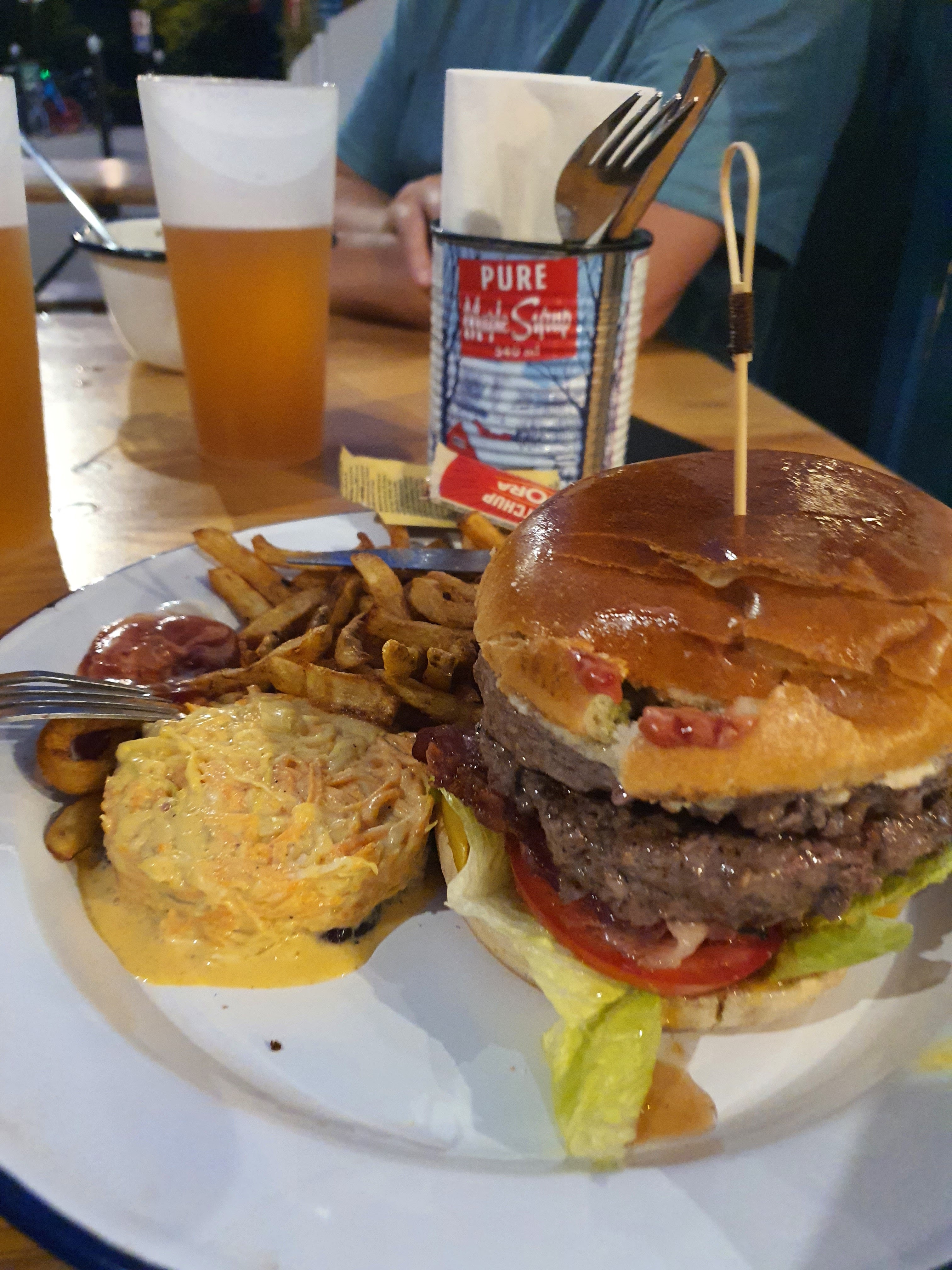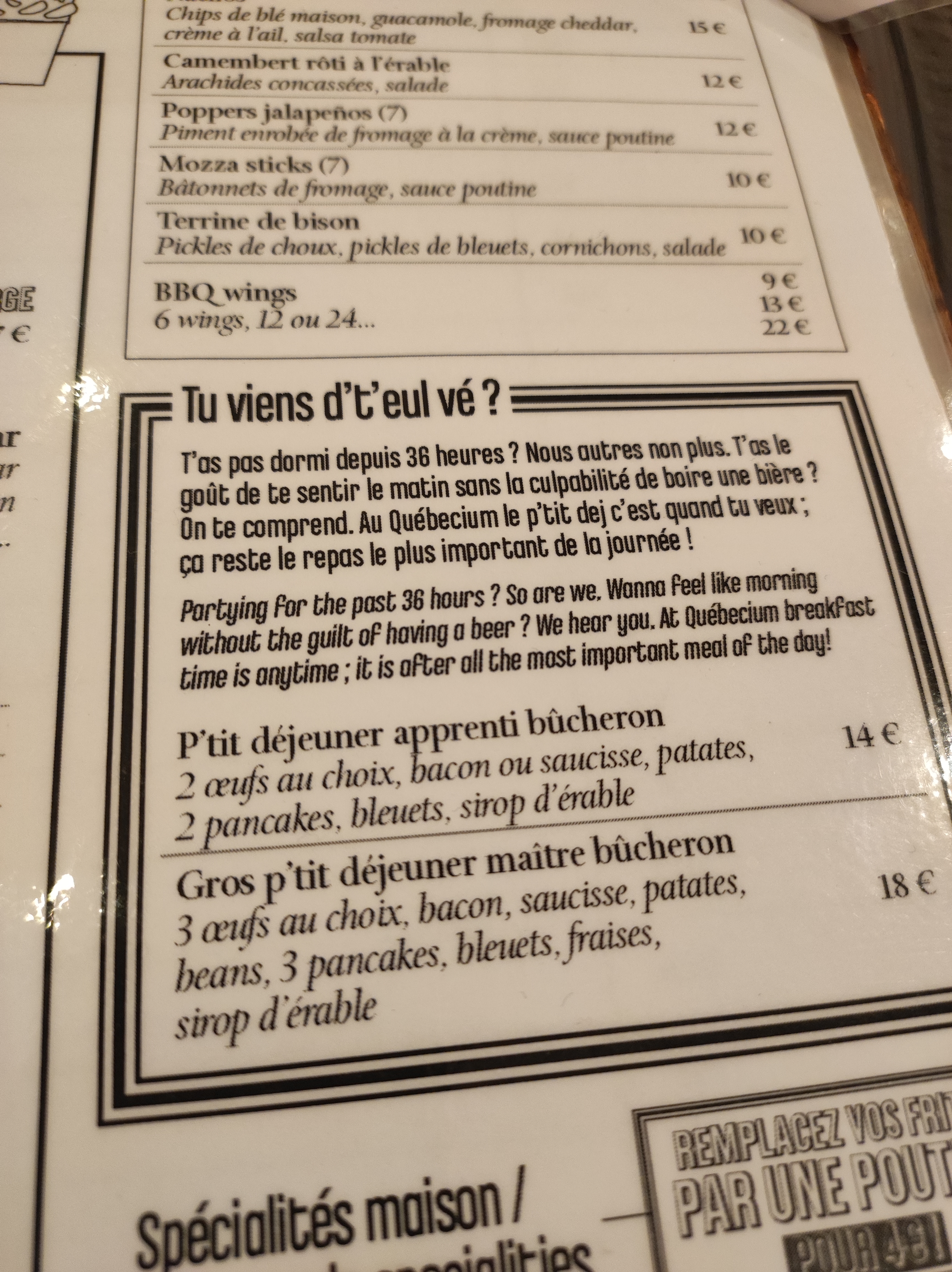 Une belle découverte, ambiance québécoise, odeur de sirop d'érable, bières et mets de la bas. La carte pittoresque est joué comme il faut c'est très agréable et j'y ai passé un bon moment. Je recommande. Une note spéciale pour la gentillesse du personnel.