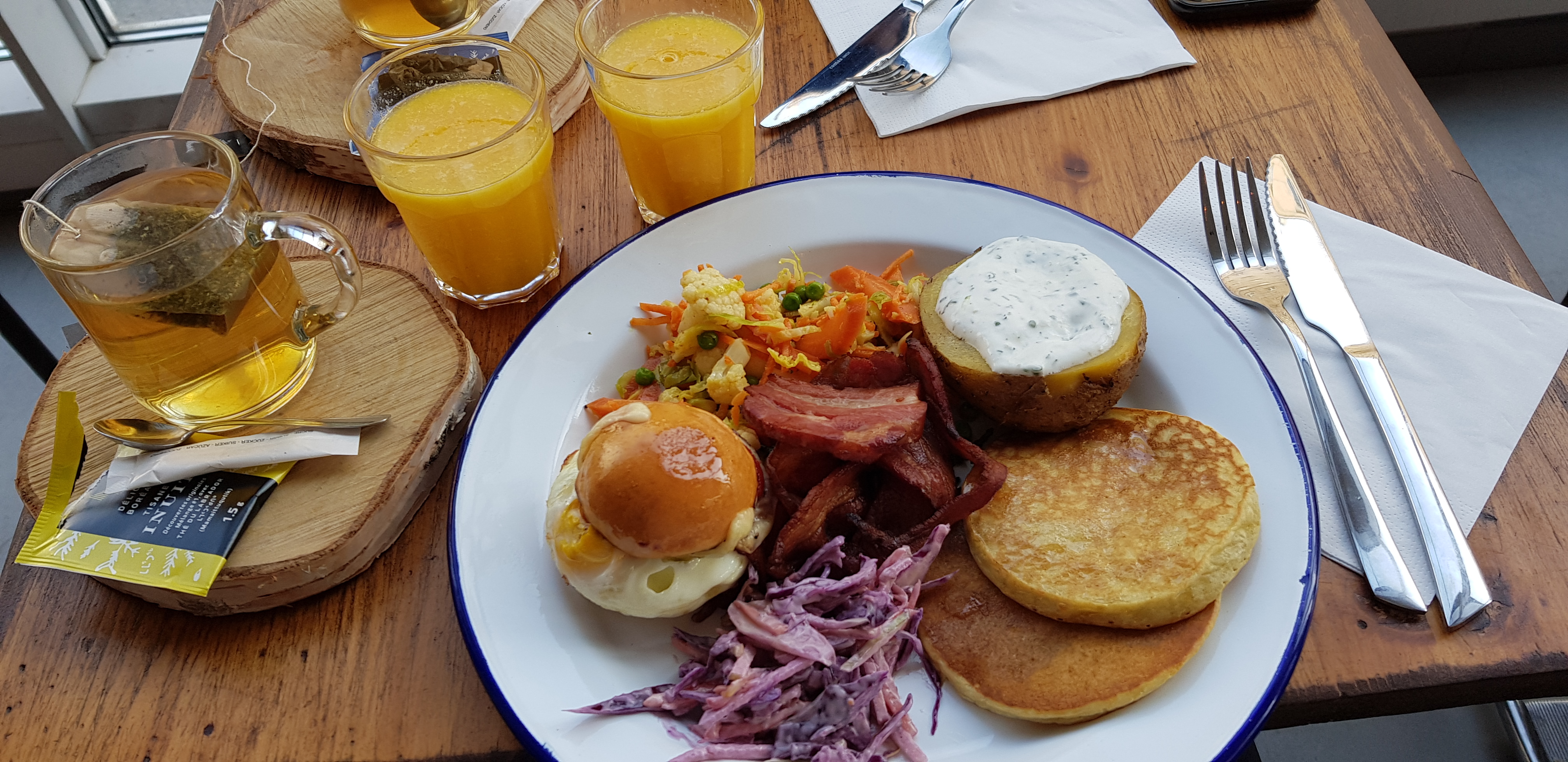 Brunch du Dimanche pour mon anniversaire, très copieux, plats simples mais bien réalisés, délicieux sandwich au saumon mariné, pancake et bacon au sirop bien sûr...Équipe TRES sympathique, merci pour l'accueil, on a adoré !