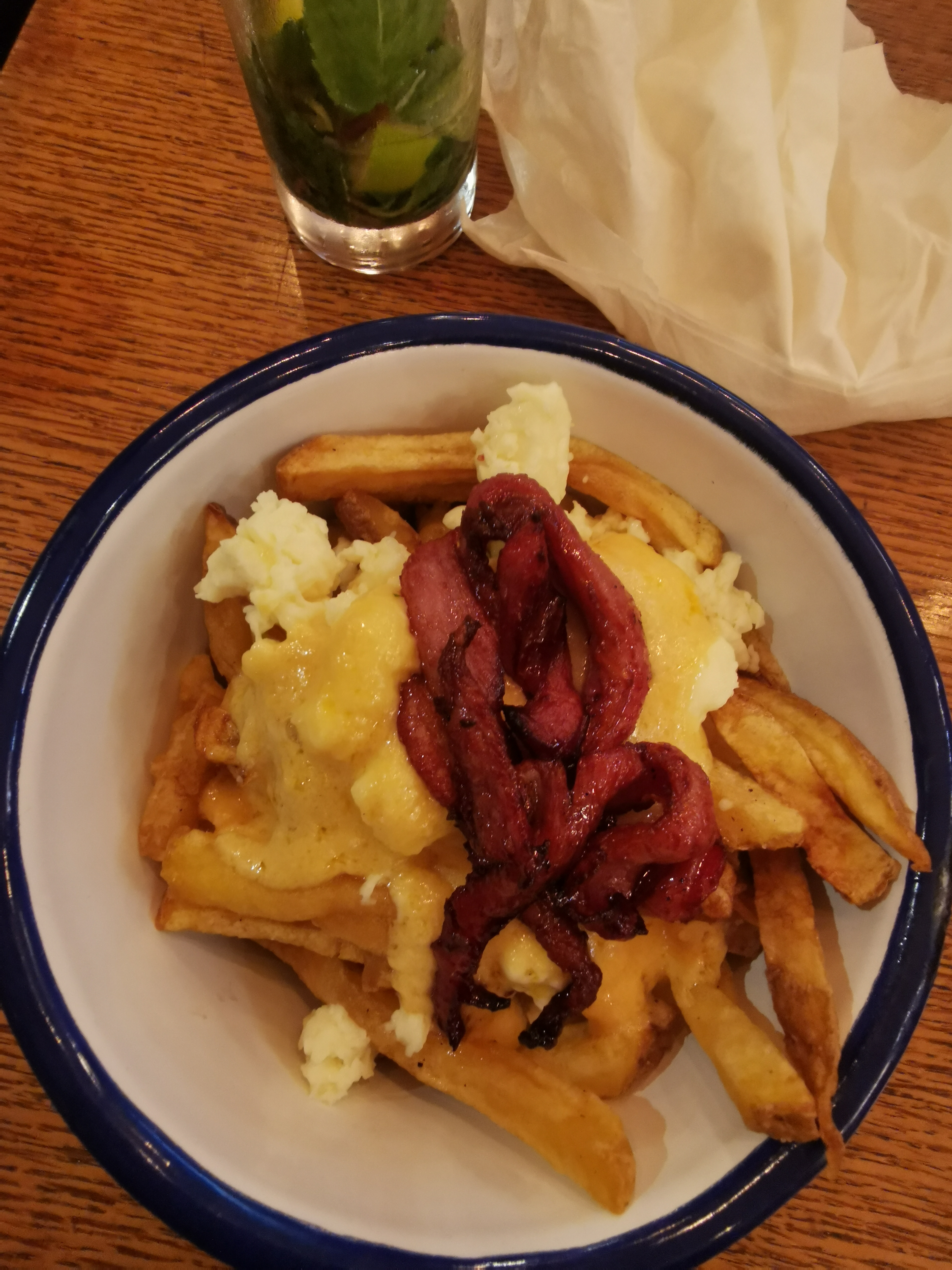 Restaurant à fuir ! Service déplorable : serveuse qui traîne des pieds, jette les plats sur la table, est incapable de répondre à nos questions sur la sauce de la poutine et qui nous répond « je ne sais pas, je suis pas cuisinière moi » (c’est quand même la spécialité de la maison !), sans chercher à se renseigner pour nous répondre. 3 demandes à 2 serveurs différents pour obtenir une bière. La 2ème commandée n’est jamais arrivée mais a failli être facturée si nous n’avions pas été vigilants. Et enfin, que dire de la poutine ? Des morceaux entiers de gras, un fromage non fondu dans certains plats ou alors « élastique » en bloc (voir photo), dans d’autres. Pour le mojito, la photo parle d’elle même, nous l’avons laissé entier.. On ne dira rien sur le cuisinier qui fume devant le restaurant en plein service .. C’est vraiment limite et très dommage car le lieu est sympa ..