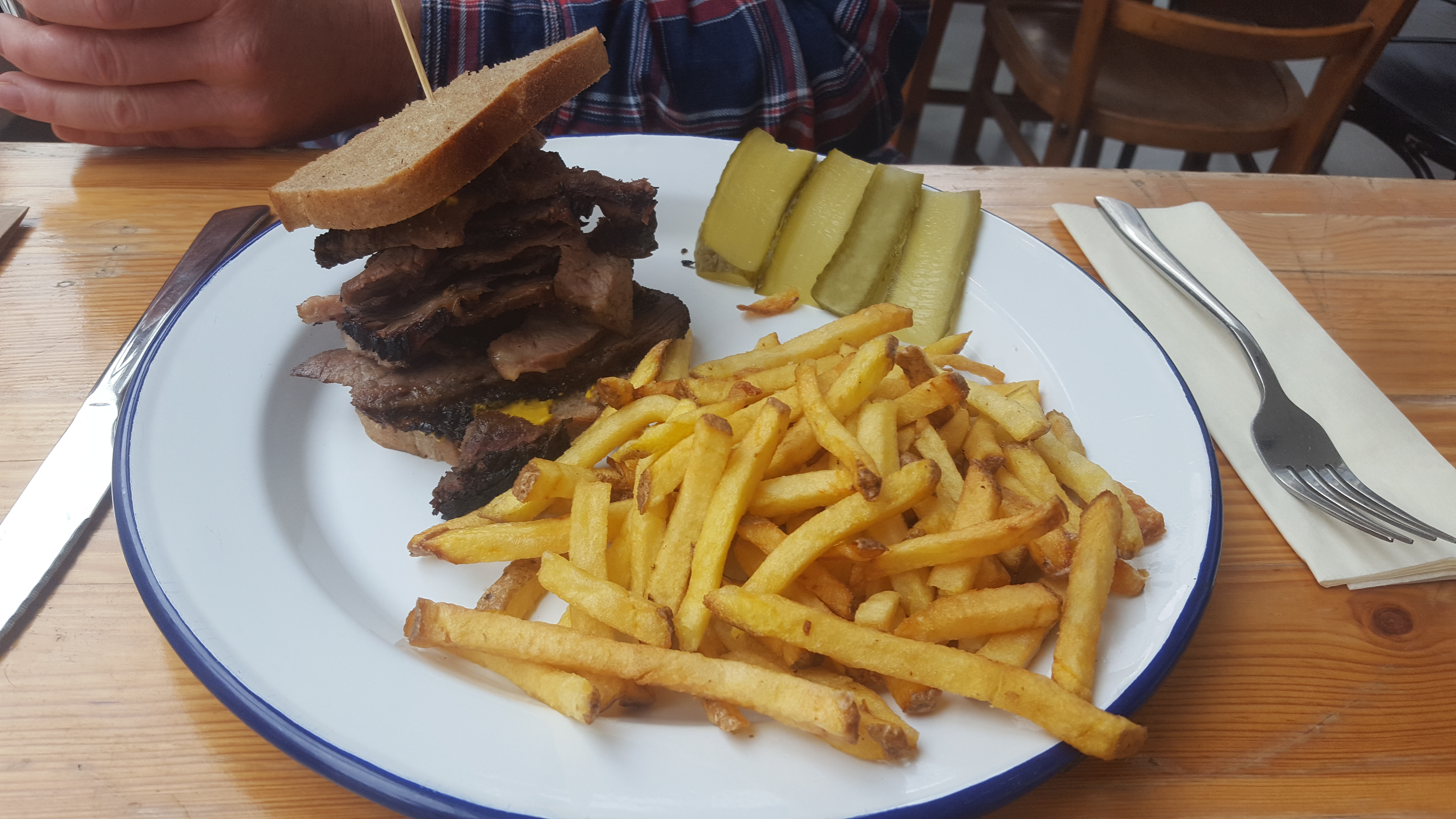Un endroit très sympa. Le propriétaire Ben, fume lui-même son smoked meat qui d'après le connaisseur Québécois de mon entourage valide. C'est différent mais très bon. J'ai testé le burger et je dois l'avouer il est bon (ratage sur la cuisson de la viande j'avais demandé saignant et c'était bien cuit). Le ratio condiments, sauce et viande et très bon. Je valide cet endroit.